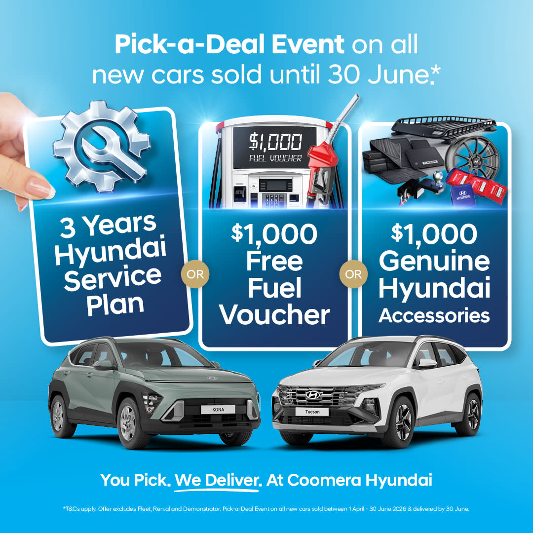 *Terms and conditions apply. All customers who purchase a new Hyundai vehicle between 1 April 2026 and 30 June 2026 and with a vehicle delivery on or prior to 30 June 2026 will be eligible one (1) opportunity per purchased vehicle to select one of the three offered deals. The deal will be issued to the customer on delivery of their vehicle on or prior to 30 June 2026, or if the customer chooses a Voucher, the Voucher will be delivered within one (1) week of vehicle delivery. Excludes government, fleet, demonstrator vehicles, and rental buyers. Deals offered include: 3 years Hyundai Service Plan, $1,000 Fuel Voucher, and $1,000 Voucher for Genuine Hyundai Accessories. Offer is subject to change, cancellation, and not available in conjunction with any other offer or discount.